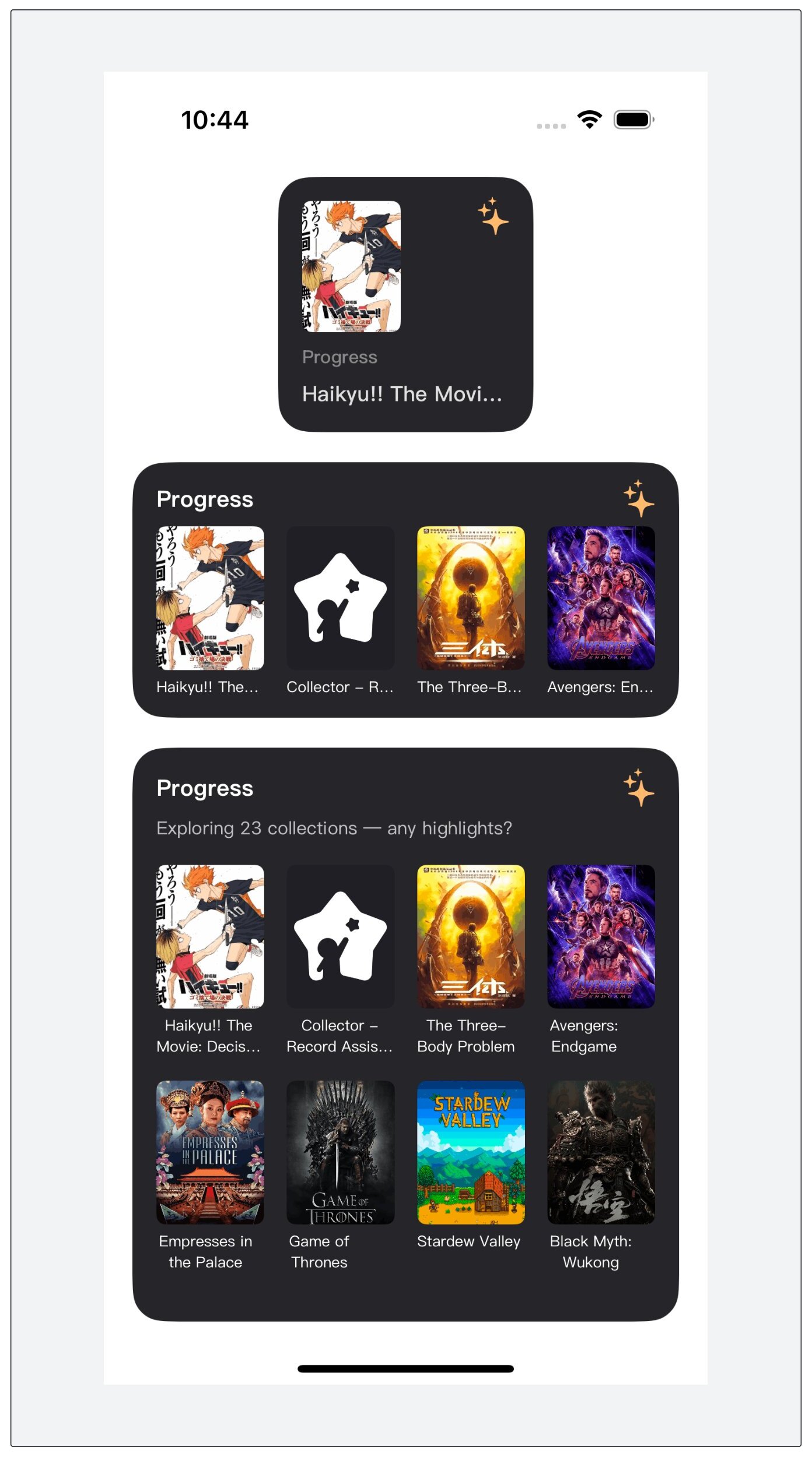Displays your existing collections for quicker access. By default, it shows your Progress Collections.