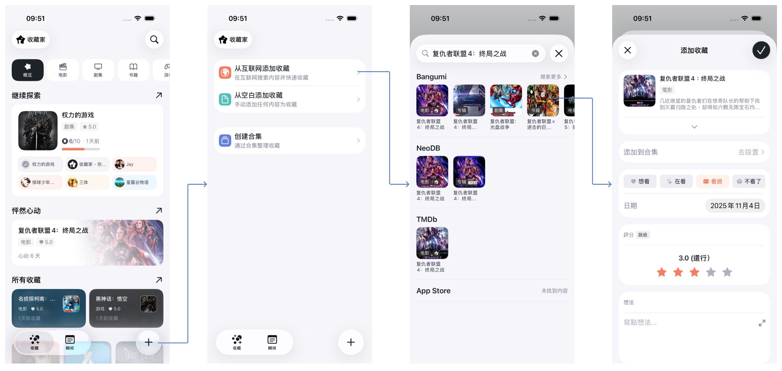 收藏家可以让你基于互联网数据添加收藏,目前支持的数据源有: NeoDB、TMDb、Bangumi、App Store。